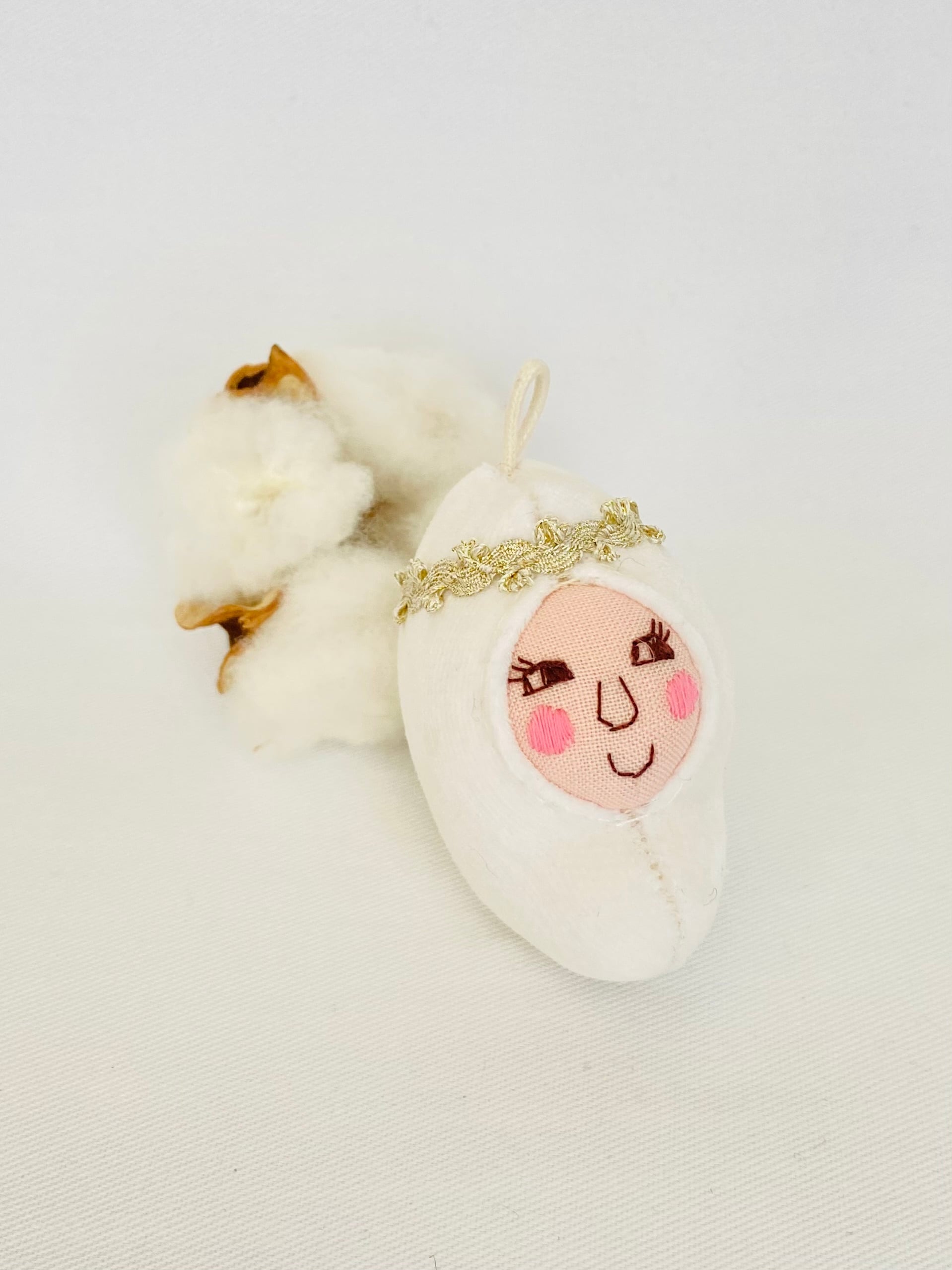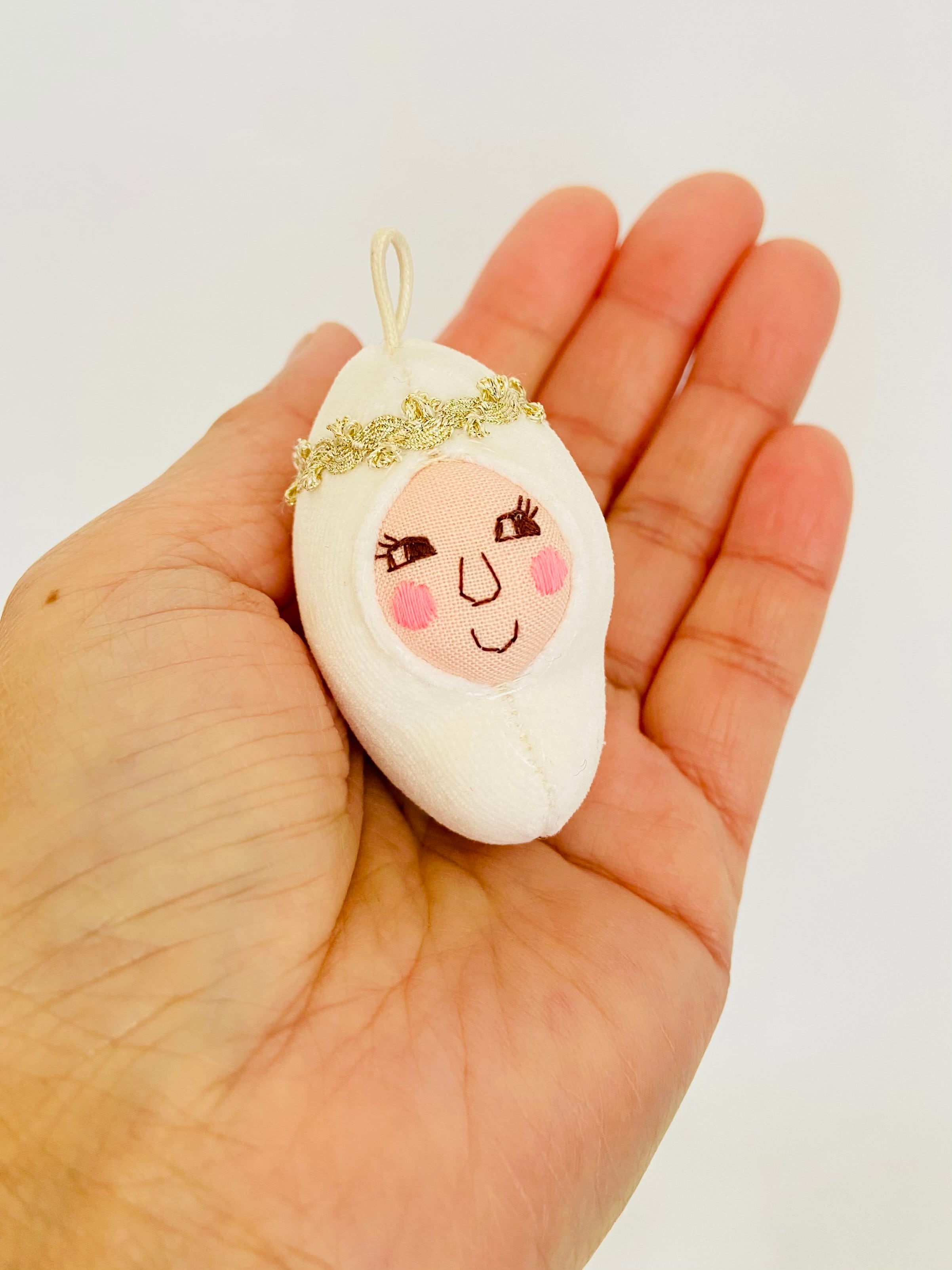 雪の妖精をイメージした小さな白い豆ずきんです。