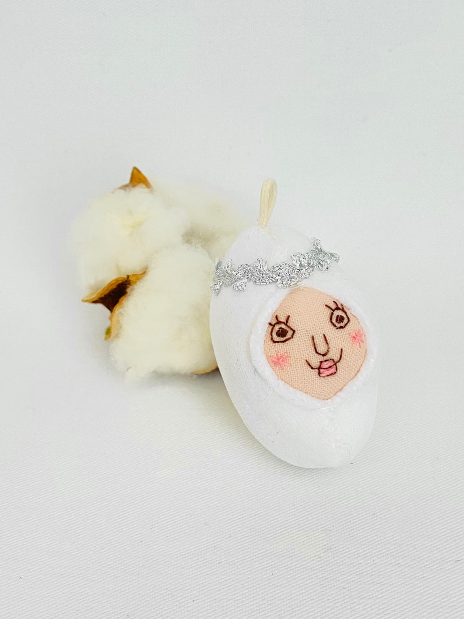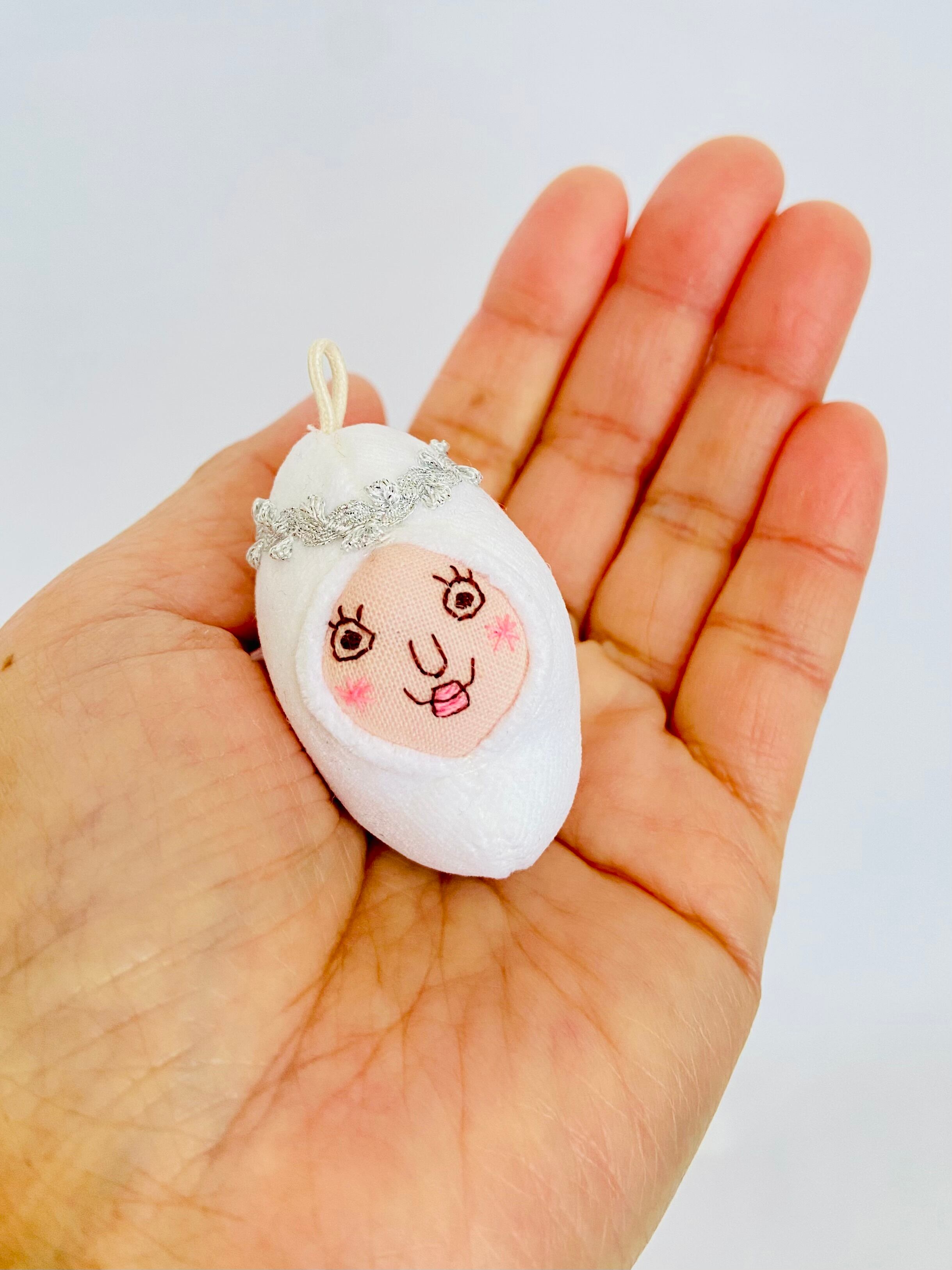 雪の妖精をイメージした小さな白い豆ずきんです。