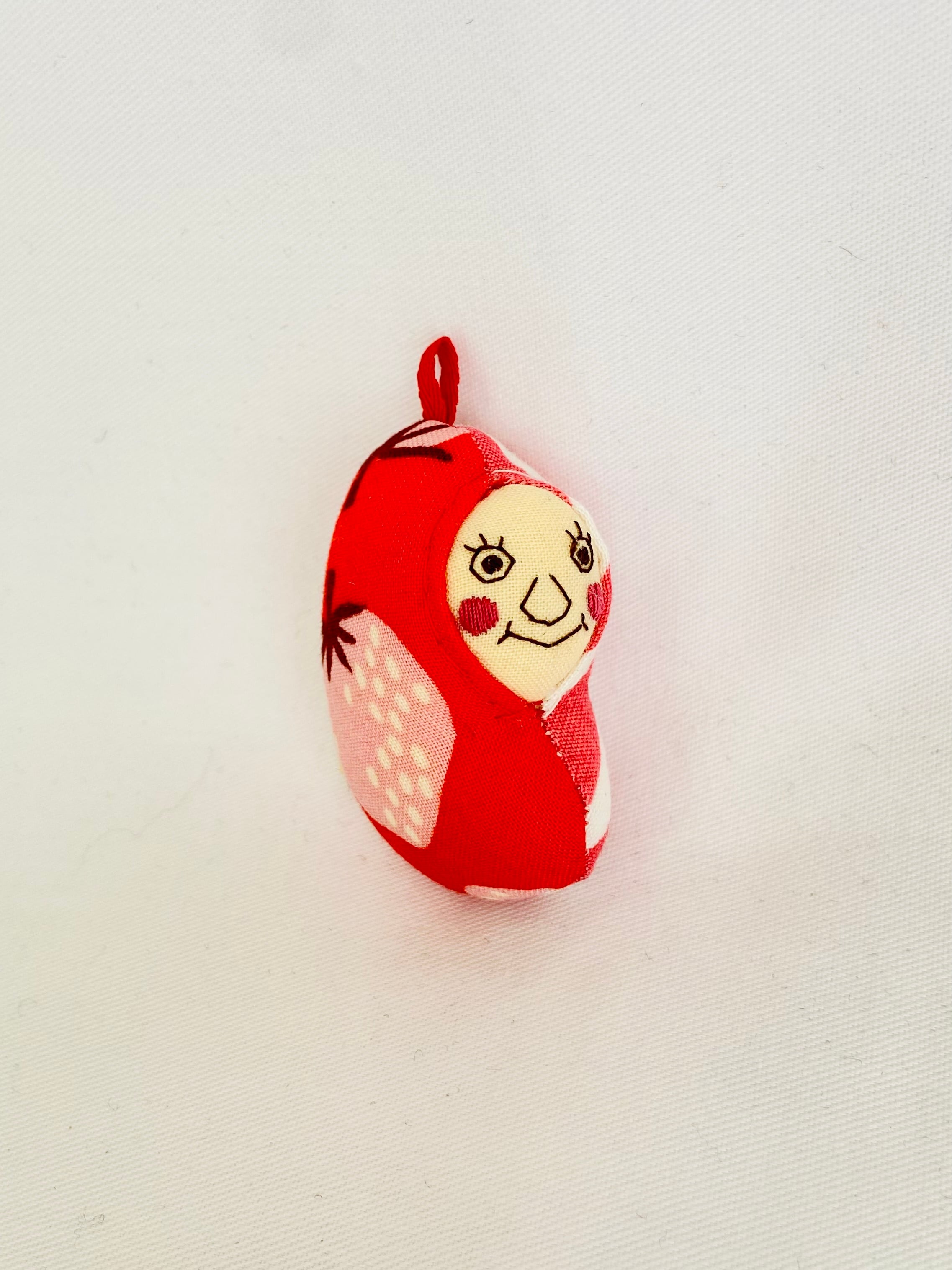 赤地に大きなピンクのイチゴが描かれた生地と、ラッピングのような斜めボーダーの生地を合わせました。ピンクで統一感を出しています。キョトンとし目とニンマリしたスマイルが可愛い子です。